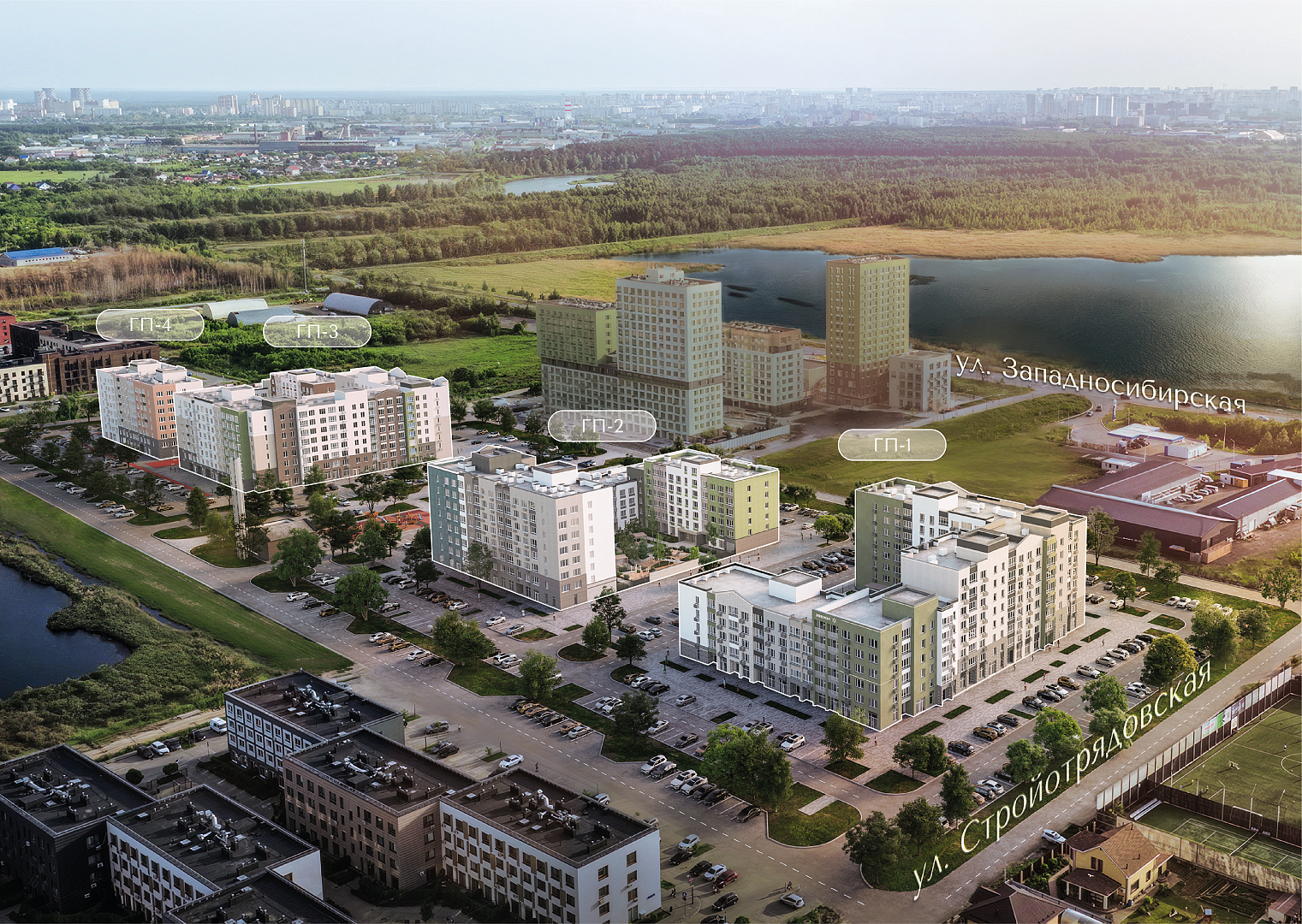 ЖК комфорт-класса расположен на пересечении улиц Западносибирская и Стройотрядовская в окружении озер и зеленых массивов.